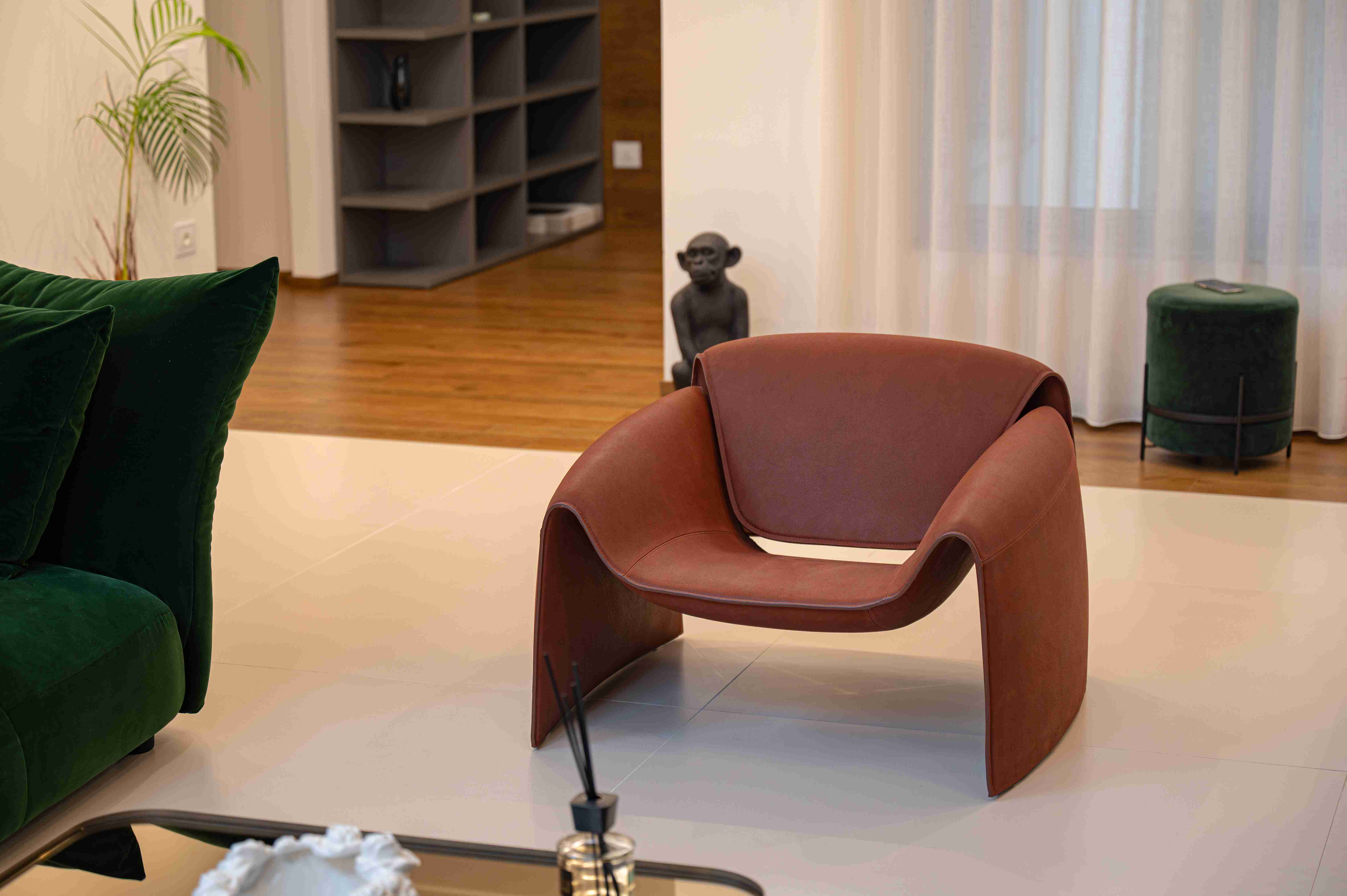 Il living è dominato da un grande divano in velluto verde smeraldo Edra, modello Standard, che cattura l’attenzione grazie al suo cuscino intelligente, modellabile per offrire un comfort personalizzato. Accanto al divano, la poltrona Poliform, modello Le Club, disegnata da Jean Marie Massaud, aggiunge un tocco di eleganza moderna, senza compromettere il comfort.