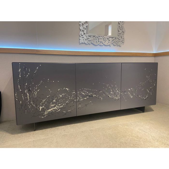 Decorazione artistica su ante, top e fianchi con resina colore argento.