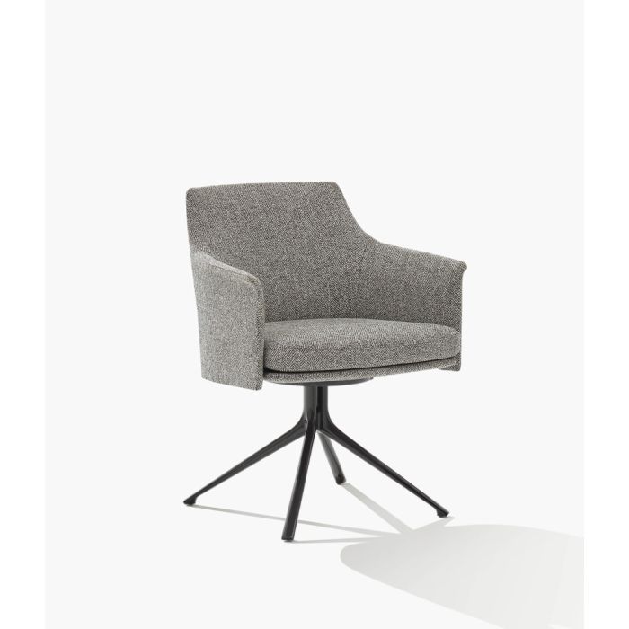 Presenta un guscio sottile e avvolgente su un’esile struttura con base girevole. Rivestita in tessuto o pelle, con o senza braccioli, è pensata per gli spazi di casa ma è ideale anche negli ambienti di lavoro. La struttura presenta lo schienale poliuretanno flessibile stampato, con seduta in poliuretano flessibile a quote differenziate. La base è in fusione alluminio verniciato, con girevole con ritorno.